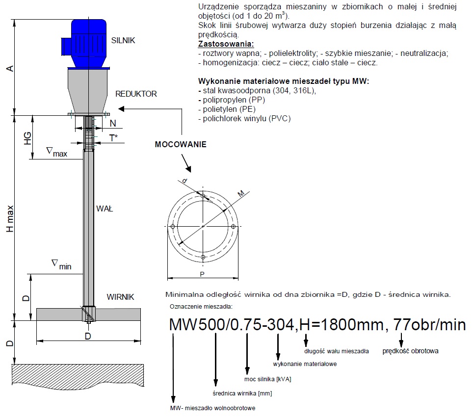 Oznaczenie mieszadła wolnoobrotowego: MW średnica [mm]/ N [kVA]/ wykonanie materiałowe