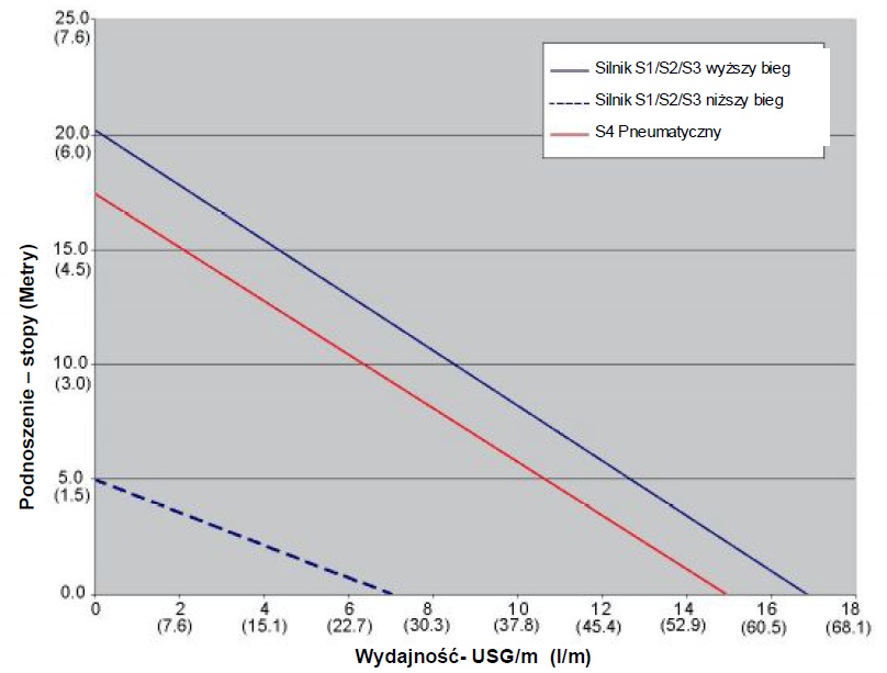 Uwaga: Wszystkie testy przeprowadzono na wodzie w temperaturze 20 oC. Rzeczywista wydajność może się różnić o +/- 10%. Rzeczywista wydajność zmniejsza się wraz ze wzrostem lepkości lub ciężaru właściwego medium. Lepkość I wydajności określone zostały przy silniku elektrycznym na wyższym biegu.