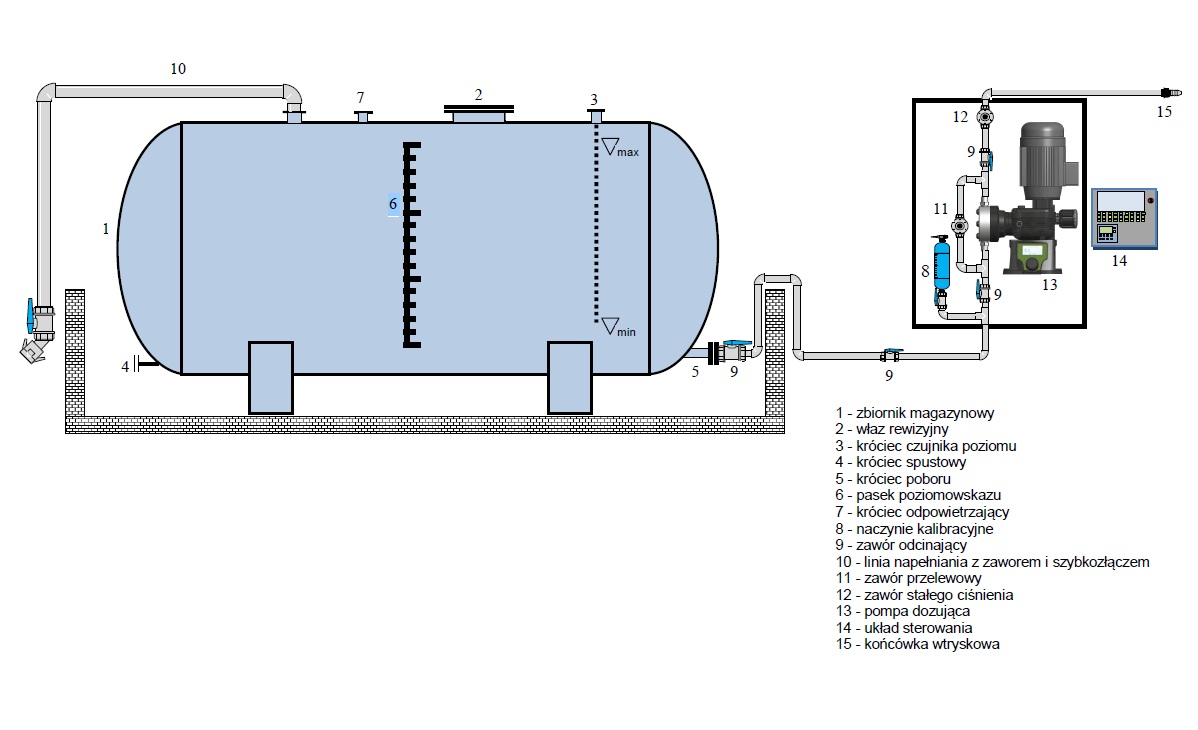 Przykładowa stacja magazynowania i dozowania koagulanta w układzie zbiornika jednopłaszczowego poziomego