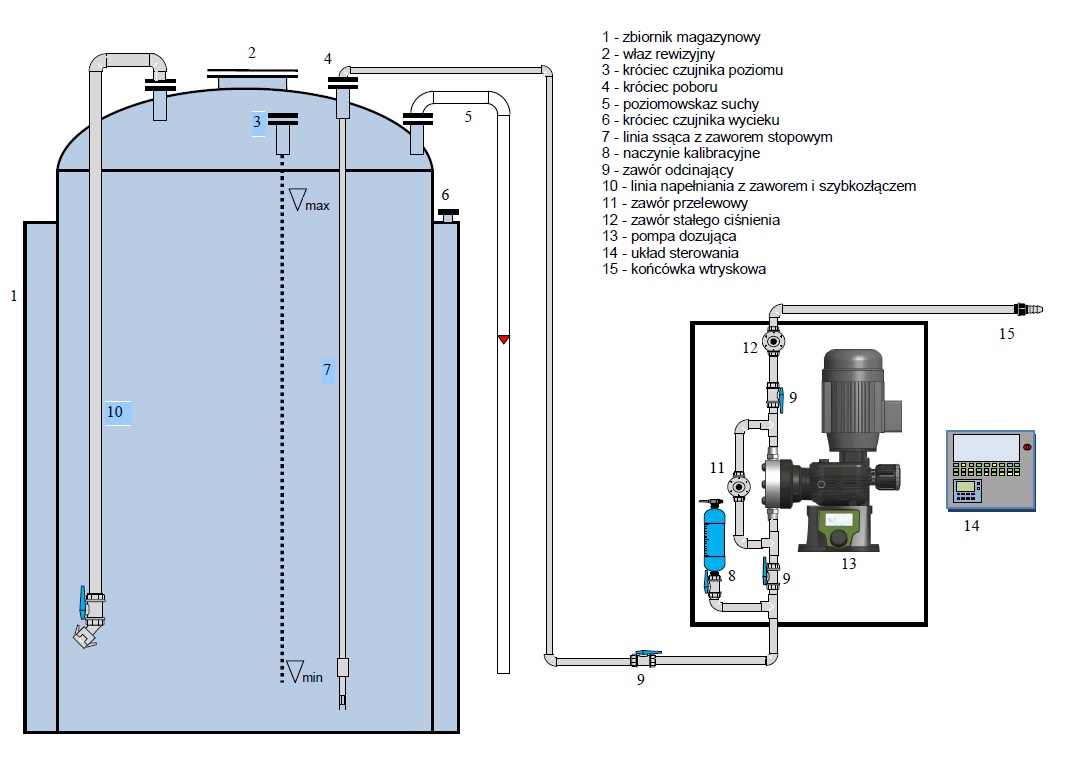 Pompa dozująca wraz z osprzętem i układem sterowania może być zabudowana w termoizolowanej, ogrzewanej szafie obiektowej zabezpieczającej urządzenia przed wpływem czynników atmosferycznych.