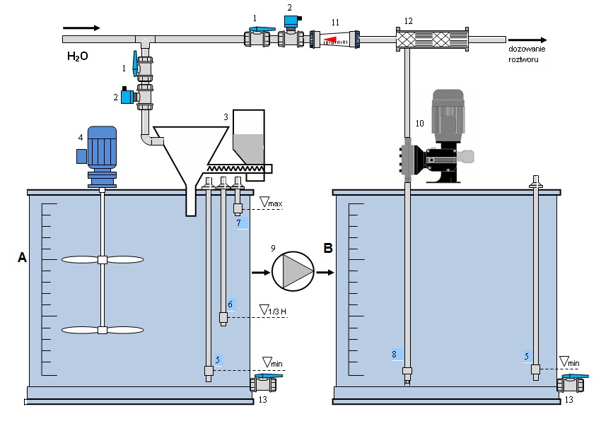 Zbiornik A służy do rozcieńczania sproszkowanego polielektrolitu i jego dojrzewania, natomiast zbiornik B jest magazynem gotowego roztworu i z niego odbywa się dozowanie.